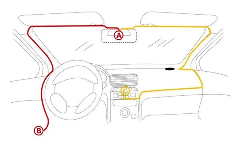Suggérez la zone d'installation comme indiqué dans le schéma, cachez la ligne de connexion le long du pare-brise avant dans le plafond et connectez-la à la boîte à fusibles via le pilier A ;